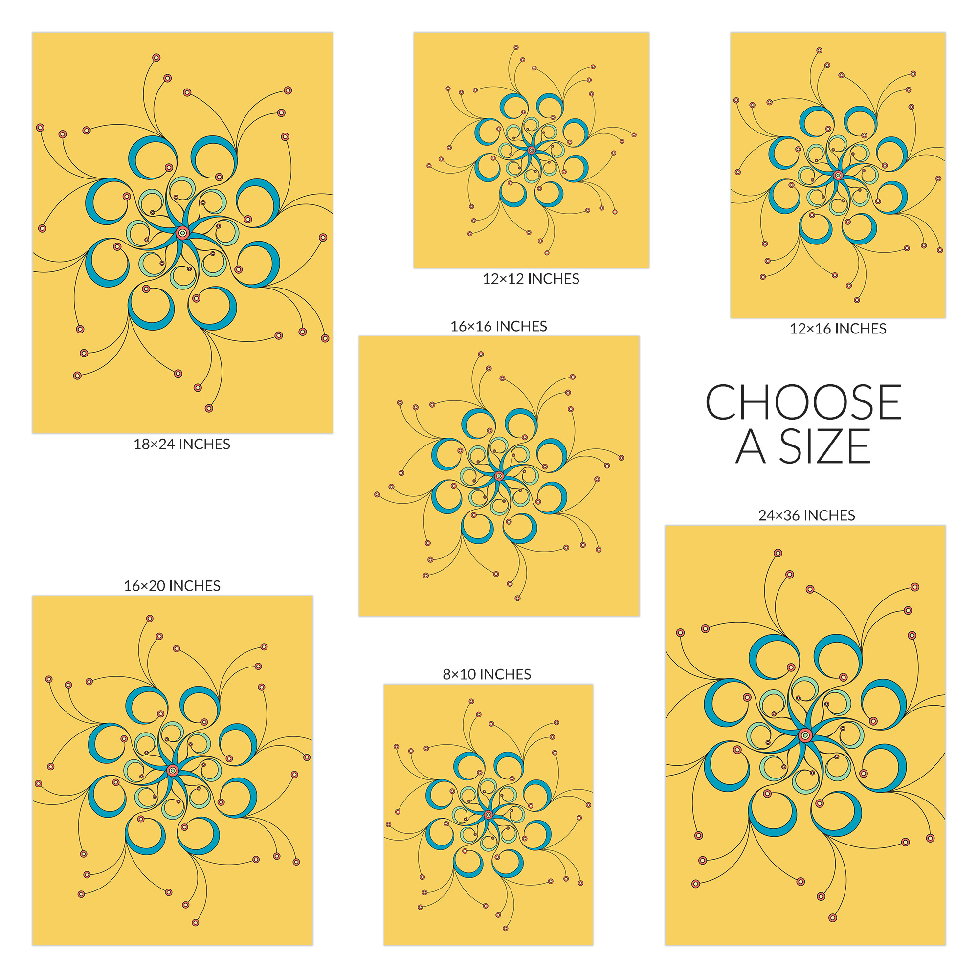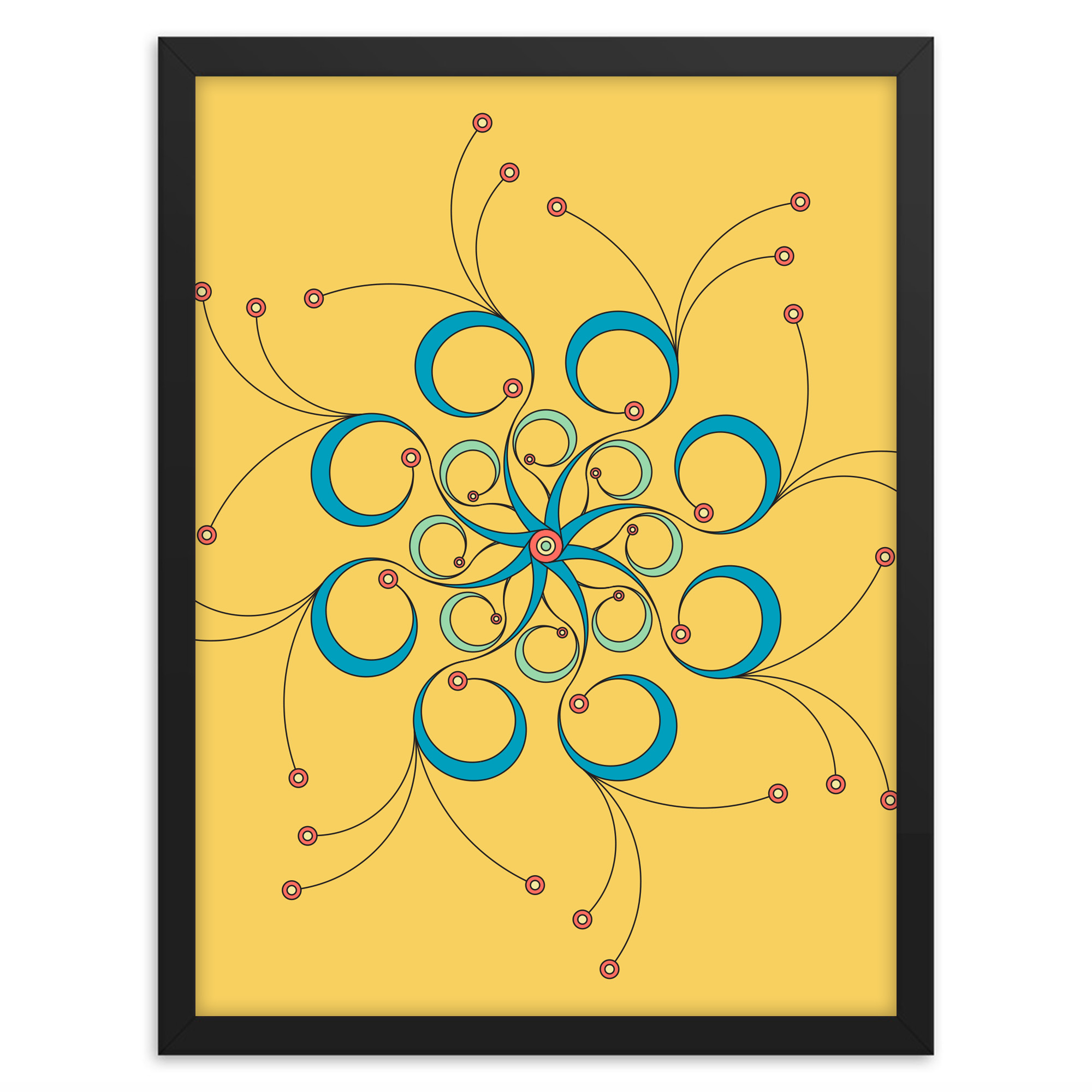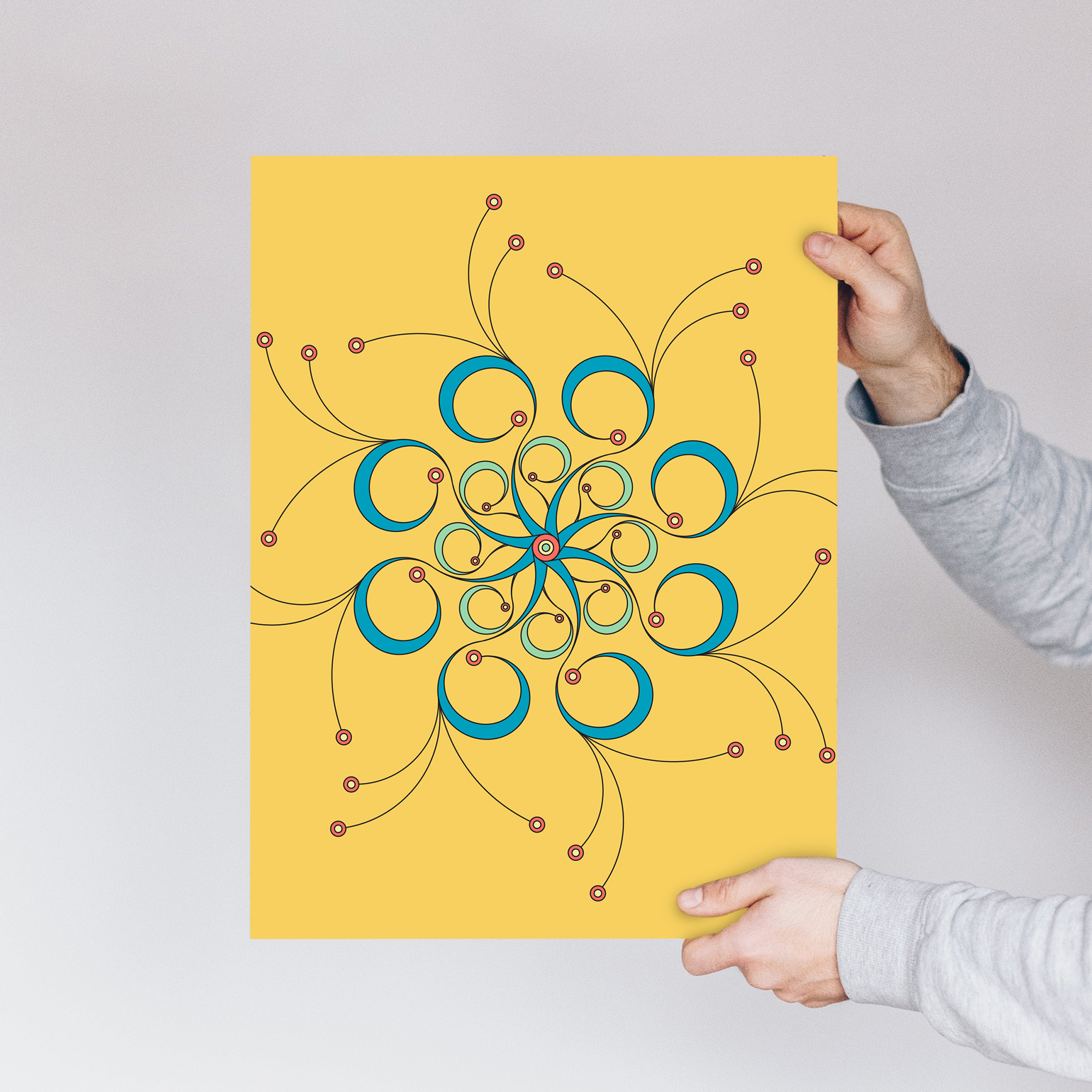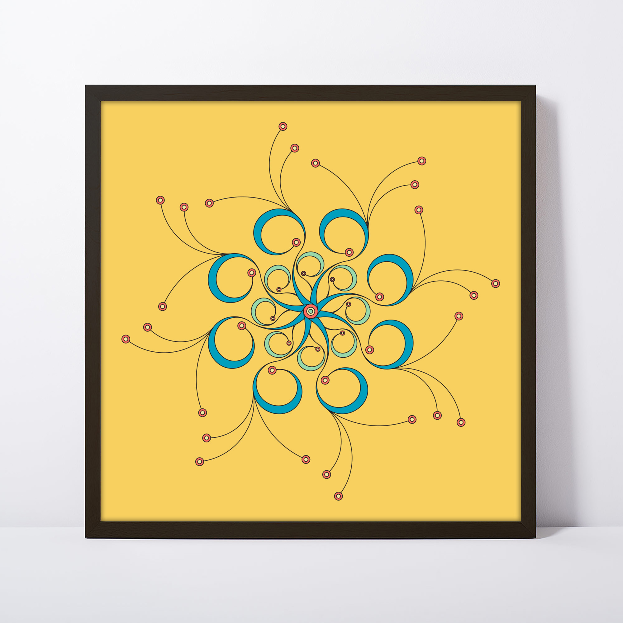 Curls is a vibrant dance of shape and color, where smooth teal arcs spiral outward in graceful motion against a warm golden backdrop. Fine lines connect to small red circles, creating a sense of flow and balance, like an abstract garden in bloom. Its playful, flowing design brings movement and joy to any room, making it perfect for livening up living spaces, studios, or creative corners.