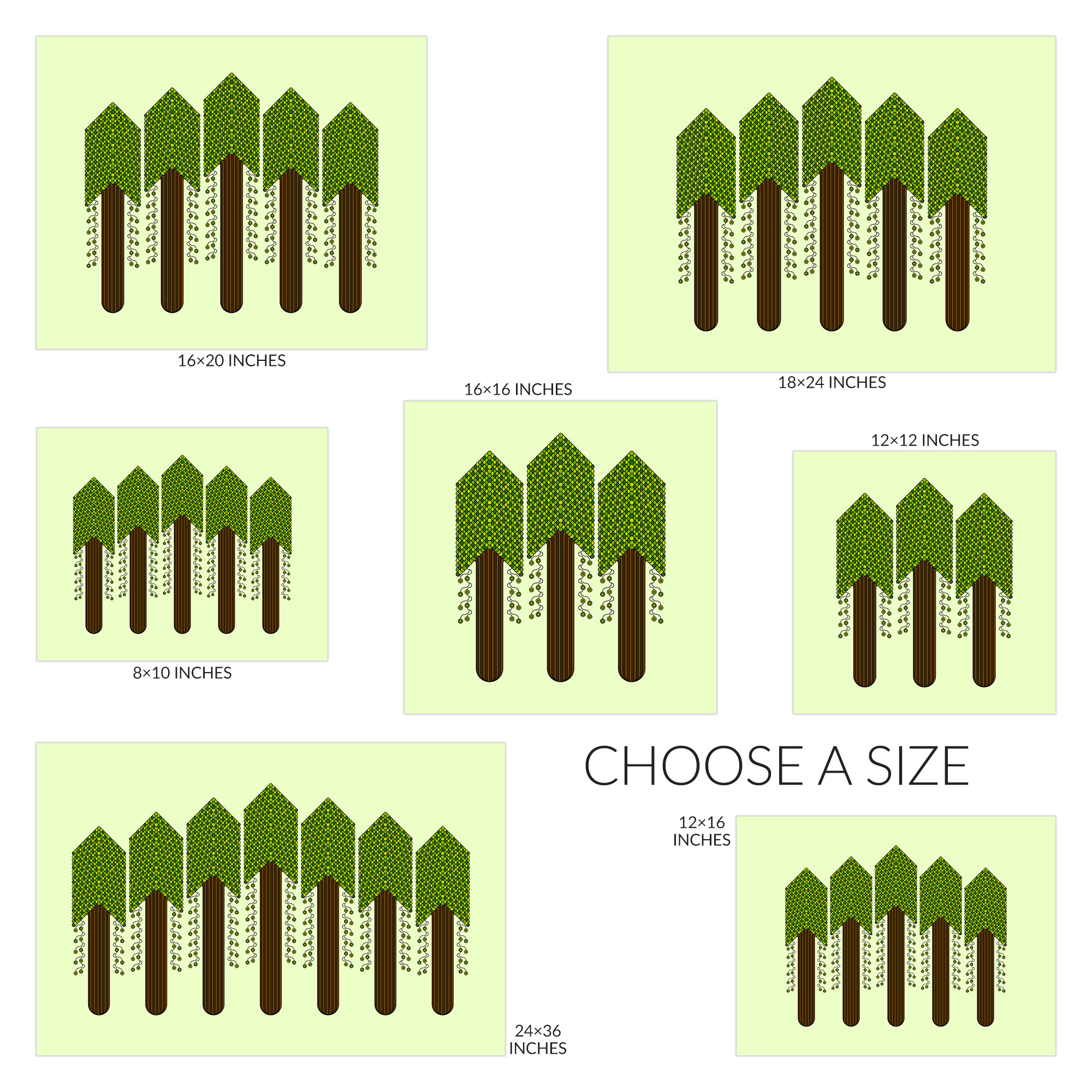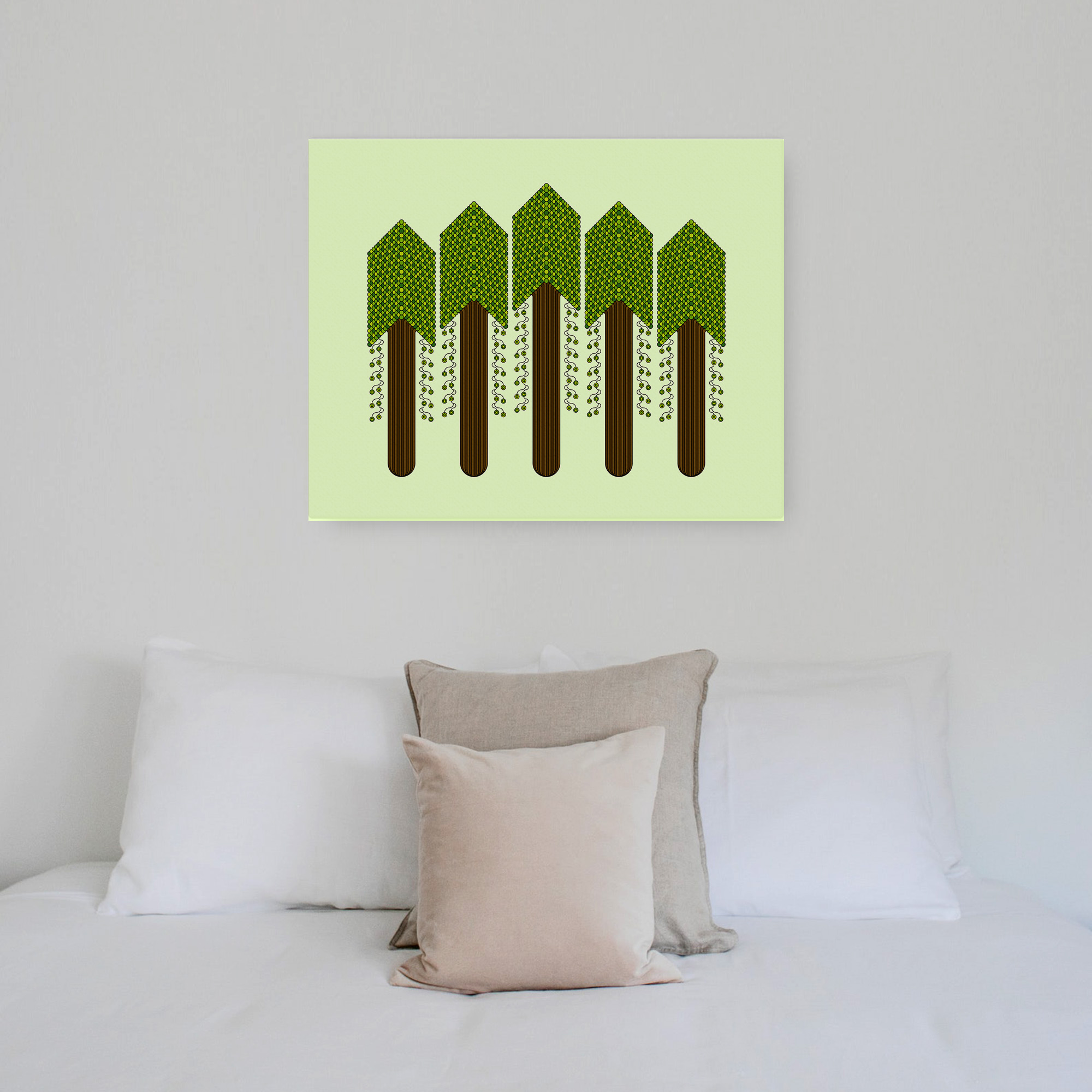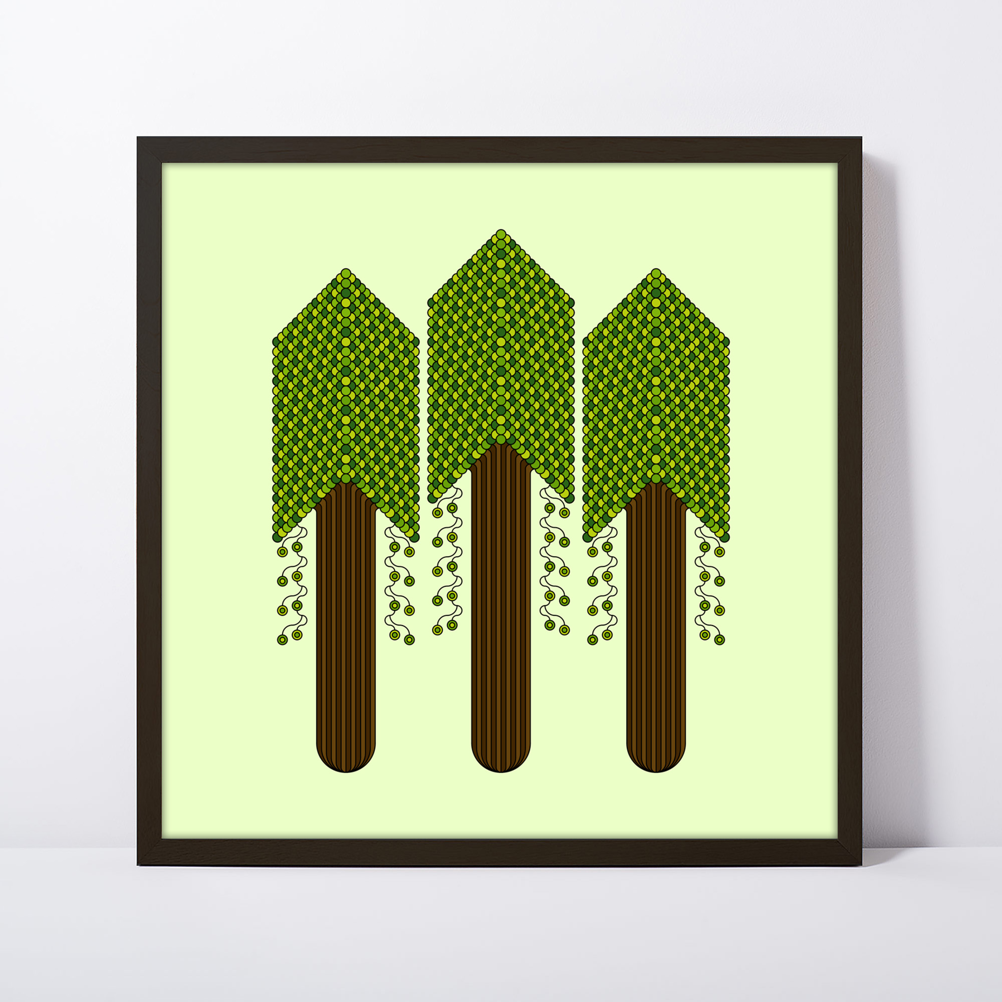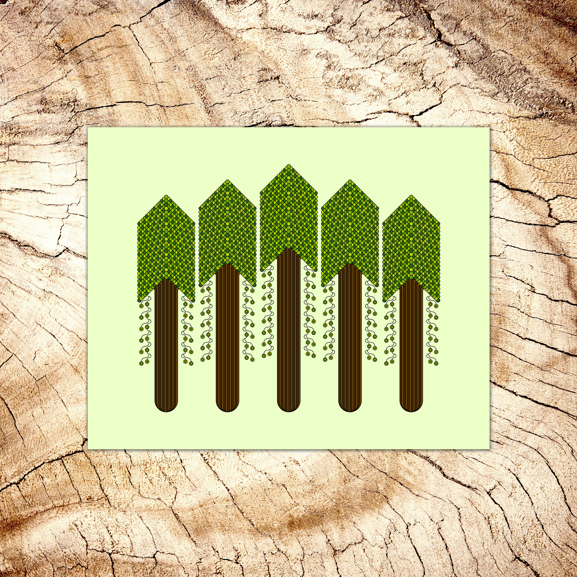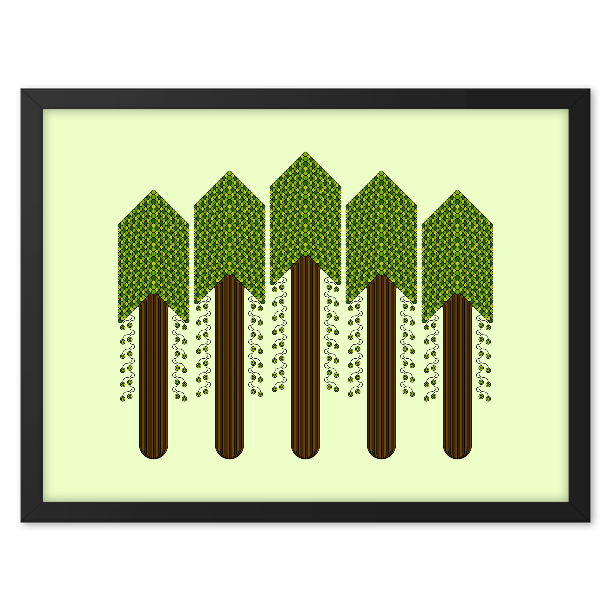 Somewhere in the Forest, a neat row of trees stands tall, their chunky trunks forming a sturdy wall of wood. Up top, bright green canopies burst with curling vines that spill down like ribbons, bringing a bit of movement and life to the clean, balanced look of this verdant illustration.